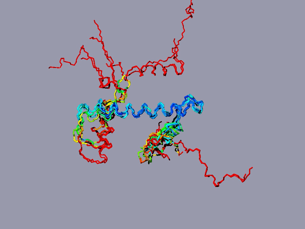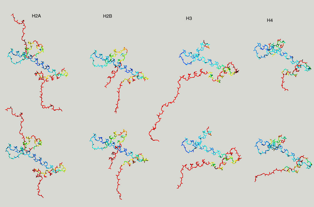 The picture shows a structure alignment of the 8 histones (2 each) that are part of the nucleosome. All the histones were colored regarding the match to H2A, except H2A, which was colored according to its match to H3. Coloring option RMS – shorter wavelengths – better match