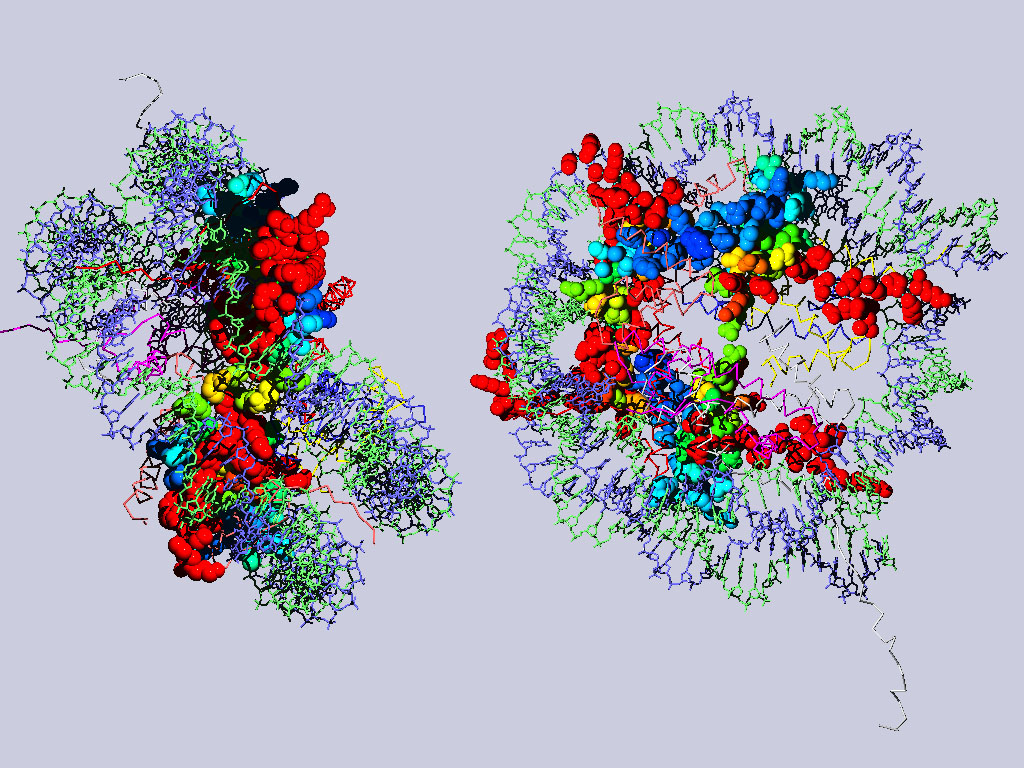Below are two views of the complete nucleosome. Histones H2A are depicted as spacefilling balls and RMS colored regarding their match to H3. The rest of the molecule is colored according to chain.